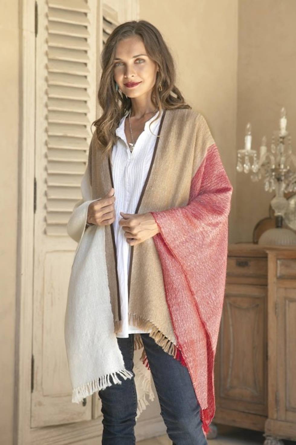 "Combining hues of snow white, crimson and tan, Peruvian artisan Stefano Basso creates this fantastic ruana. He works with 100% baby alpaca wool, the fine fleece from the season's first shearing. This warm accessory is accented with suede and petite fringes."