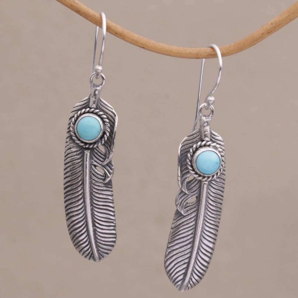 Turquoise and 925 Silver Feather Dangle Earrings from Bali 'Turquoise Transcendence' Item ID: 2671734249