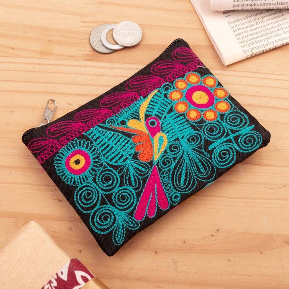 "Embroidered with a sweet hummingbird scene, this coin purse honors the Andean region's charming nature. Artisans from The Andean Travel & Adventure Association use acrylic threads to decorate the piece, whose palette of turquoise and fuchsia hues captivates with a spring aura. As the final touch, a zipper closure completes the design."