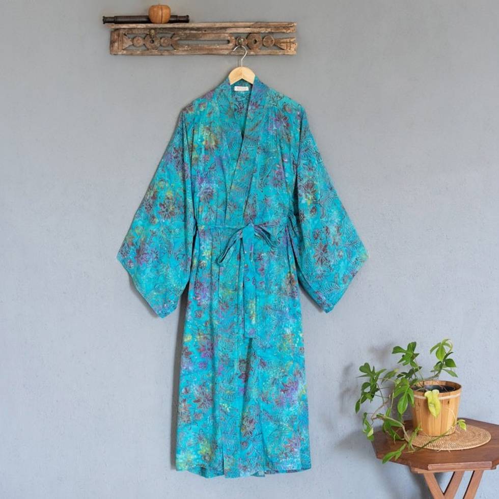 Turquoise Batik Long Sleeved Rayon Robe with Belt 'Ocean Eden' Item ID: 2671820880
