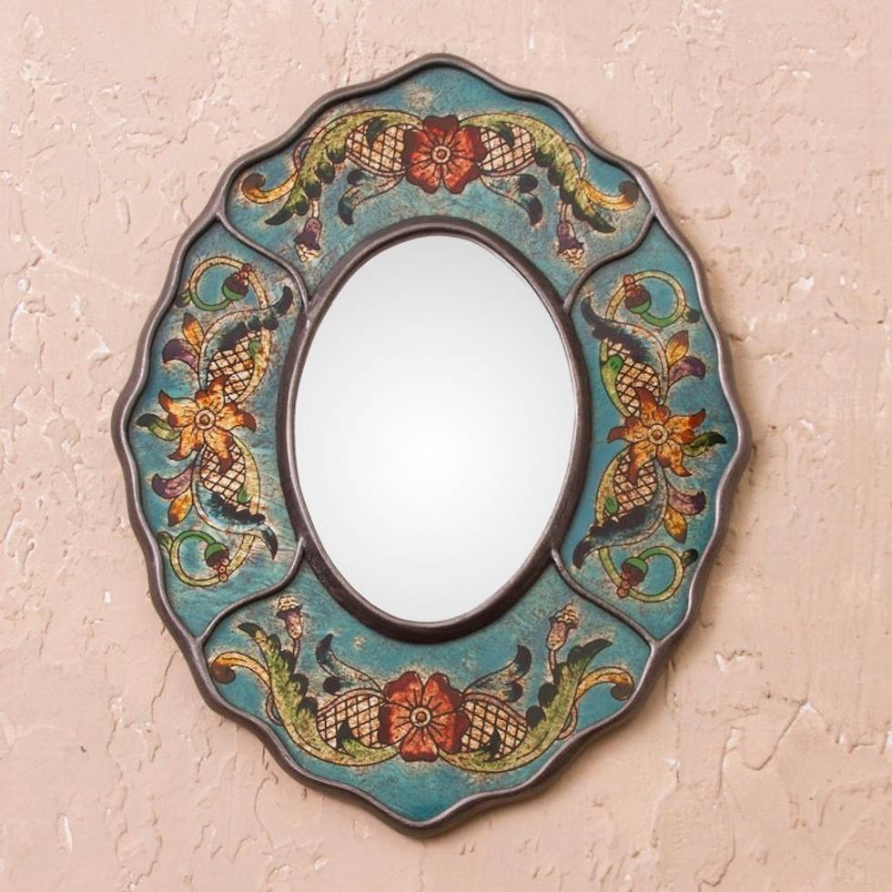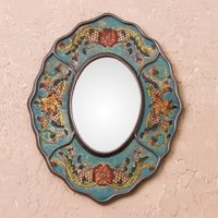 Turquoise Floral Reverse-Painted Glass Wall Mirror from Peru 'Turquoise Colonial Wreath' Item ID: 2671695636