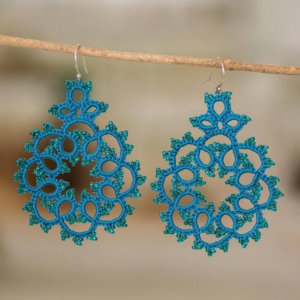 "Enchanting and magical: Guatemalan artisan Gladys Pichola's newest design is that bewitching creation you need in your wardrobe. These dangle earrings feature a windy design made in the traditional tatting technique, all embellished with glass beads and an intense turquoise tone. On top of that, sterling silver hooks allow a comfortable fit."