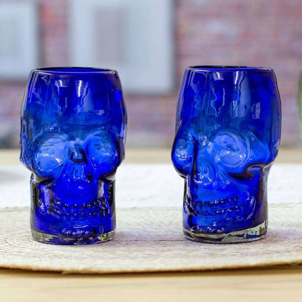 Two Blue Skull-Themed Handblown Recycled Glass Tumblers 'Blue Mexican Skull' Item ID: 2671798427