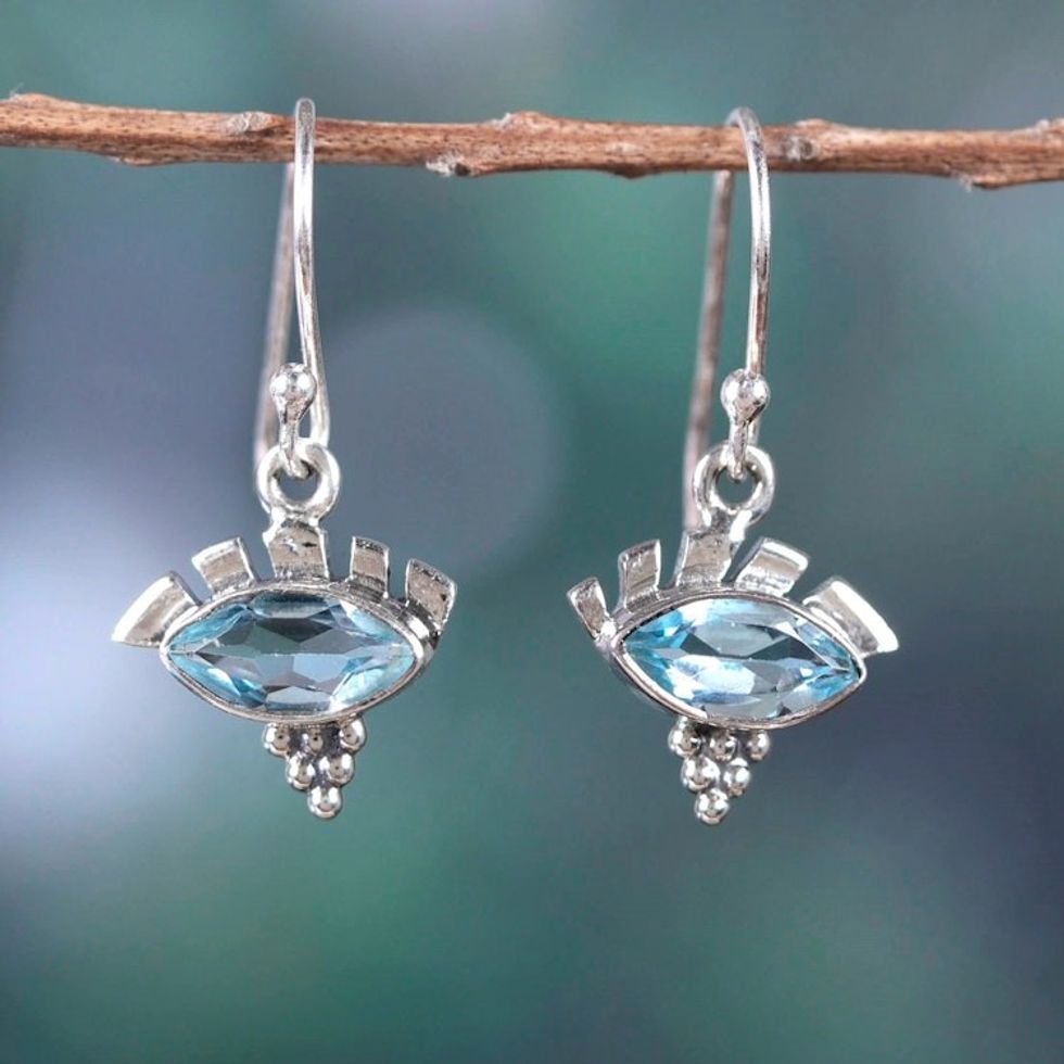 Two-Carat Marquise-Shaped Blue Topaz Dangle Earrings 'Iridescent Stare' Item ID: 2671787157
