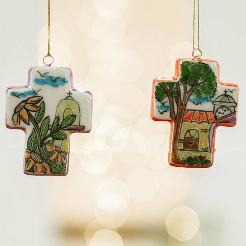 Two Church Theme Ceramic Cross Ornaments from Mexico 'Church on the Plaza' Item ID: 2671808439