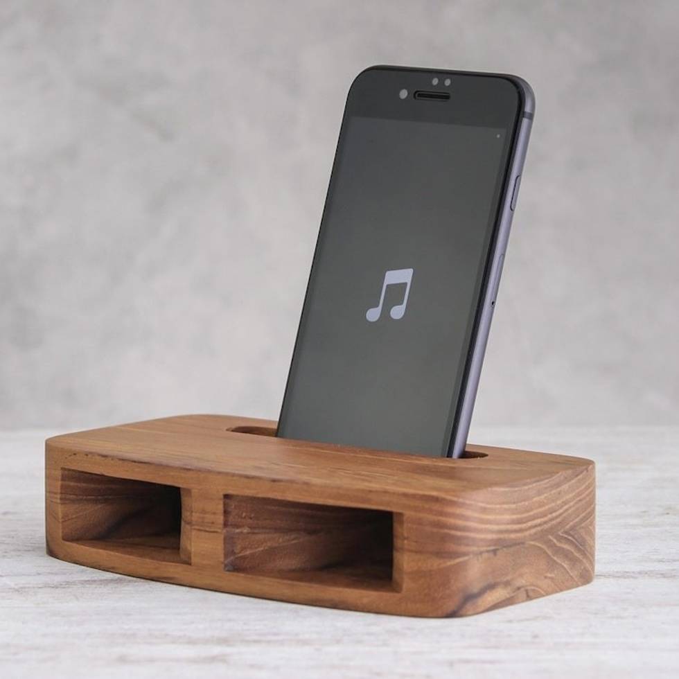 "Designed by Thai artisan Sanai Keawchaisa, this phone speaker will amplify the sound of your favorite music and podcasts. The artisan works with teak wood that features a rich, natural grain to handcraft this speaker. It features a slit at the top for inserting your phone, and two horns at the front for diffusing sound."