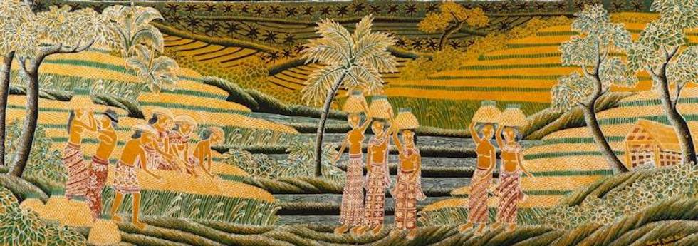 In 1974, parallel to his career as a teacher, he began to paint about Balinese everyday life: farmers' activities in the rice field, temple ceremonies, traditional markets, and dances. In 1982 Sujana decided to change his painting medium from canvas to batik and he had the opportunity to learn this technique directly from Amri Yahya, a well-known batik painter in Central Java. For three months, Sujana was deeply engrossed in studying the process of batik in the yogya style. At the end of his training, he thought that Bali should have a batik style of its own, a style that any batik lover would be able to recognize easily from the patterns on the batik cloth. He though that applying the Ubud style of painting to batik would realize this ambition.