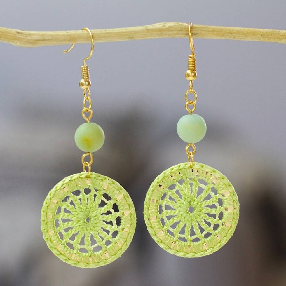 "Inspired by Greek mythology, artisan Monserrat Dominguez in Mexico creates these unique dangle earrings. She names this style 'Daphne', after the Greek water nymph who is transformed into a laurel tree. The earrings feature round hand-crocheted pendants in pistachio, topped by polished beads of amazonite. The earrings swing from 14k gold-plated brass hooks."