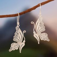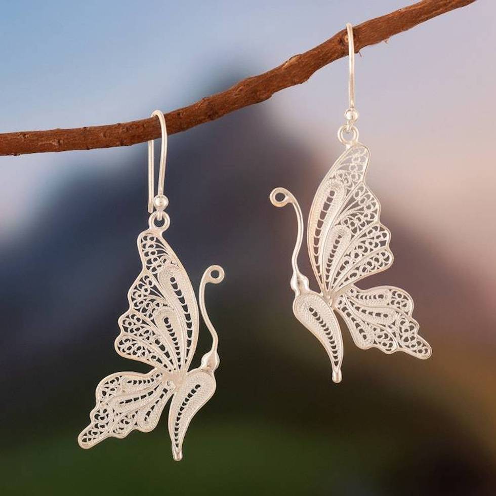 Unique Fine Silver Dangle Filigree Earrings 'White Butterfly' Item ID: 2676641500