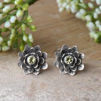Unique Floral Peridot Sterling Silver Button Earrings 'Green-Eyed Lotus' Item ID: 2671820768