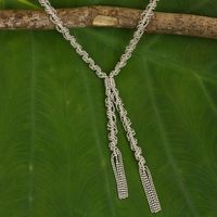 "For the collection that I want to share with you I use very small silver beads and connect them with a thin thread of silver to make a chain. That way the chain is able to bend and sway beautifully. Then I take the chains in multiple sizes and make the design look like it is woven together so it looks delicate and swaying like lace. My jewelry designs look luxurious and can be worn on different occasions.