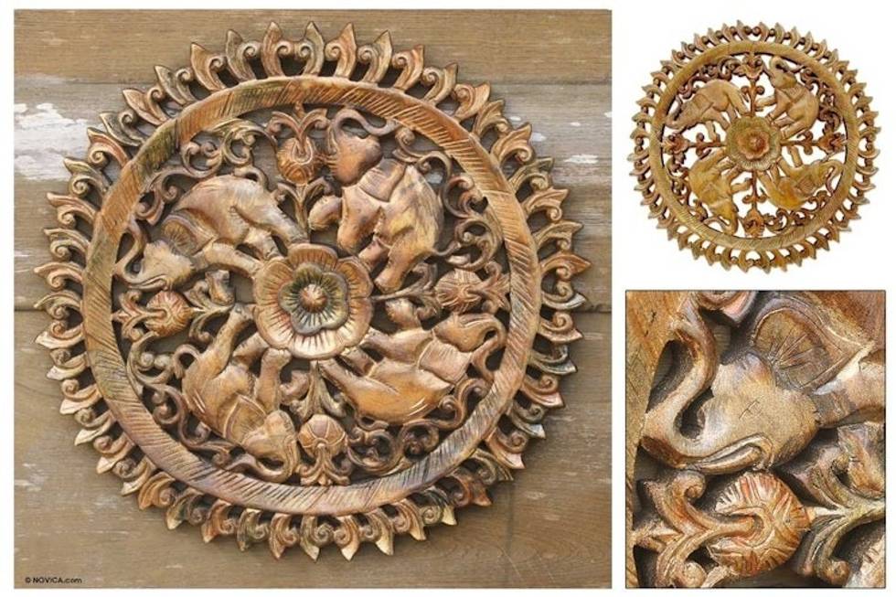Unique Teak Wood Elephant Relief Panel 'Elephant Planet' Item ID: 2671640959