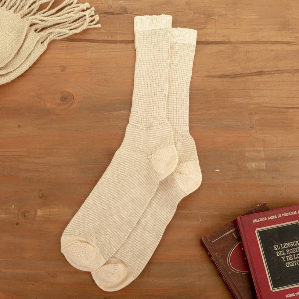 Unisex Beige and Green Cotton Socks Knitted in Peru 'Pakucho' Item ID: 2670765199