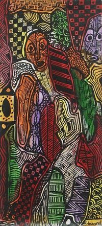 "Born to a Ghanaian mother and a Nigerian father on November 16, 1967, I began drawing at a very tender age, whatever I set my eyes on. What I fancied most, however, was copying pictures of historical figures like Sir Charles MacLean, Guggisberg, and Macarthy, which I found in the history book. Fine Arts was one of the subjects I sat for at the Ordinary Level (middle school) in 1979. Between 1988 and 1990, I sat for the Ordinary National Diploma (OND) and for the Higher National Diploma (HND) in 1995 at the Polytechnic University. I specialized in painting with textile as a subsidiary."