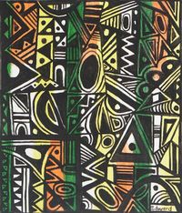 "Born to a Ghanaian mother and a Nigerian father on November 16, 1967, I began drawing at a very tender age, whatever I set my eyes on. What I fancied most, however, was copying pictures of historical figures like Sir Charles MacLean, Guggisberg, and Macarthy, which I found in the history book. Fine Arts was one of the subjects I sat for at the Ordinary Level (middle school) in 1979. Between 1988 and 1990, I sat for the Ordinary National Diploma (OND) and for the Higher National Diploma (HND) in 1995 at the Polytechnic University. I specialized in painting with textile as a subsidiary."