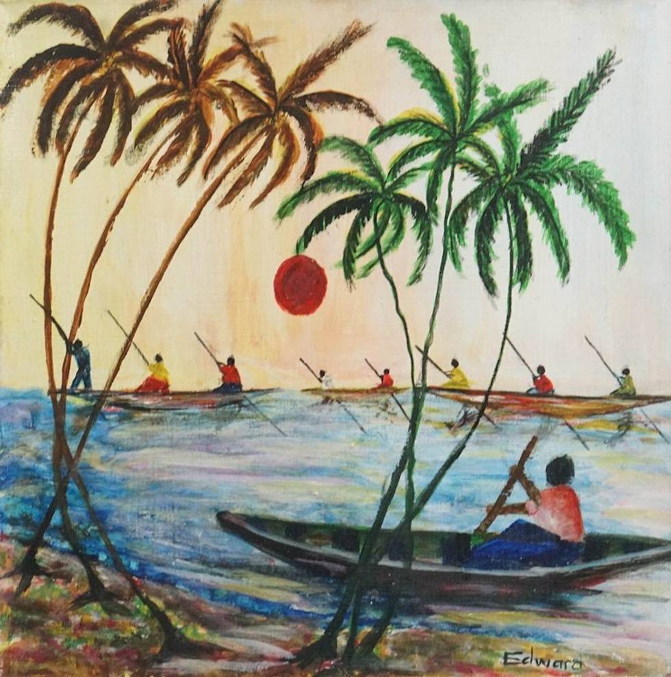 Unstretched Impressionist Acrylic Painting of Fishermen 'Fishing Race' Item ID: 2669888943