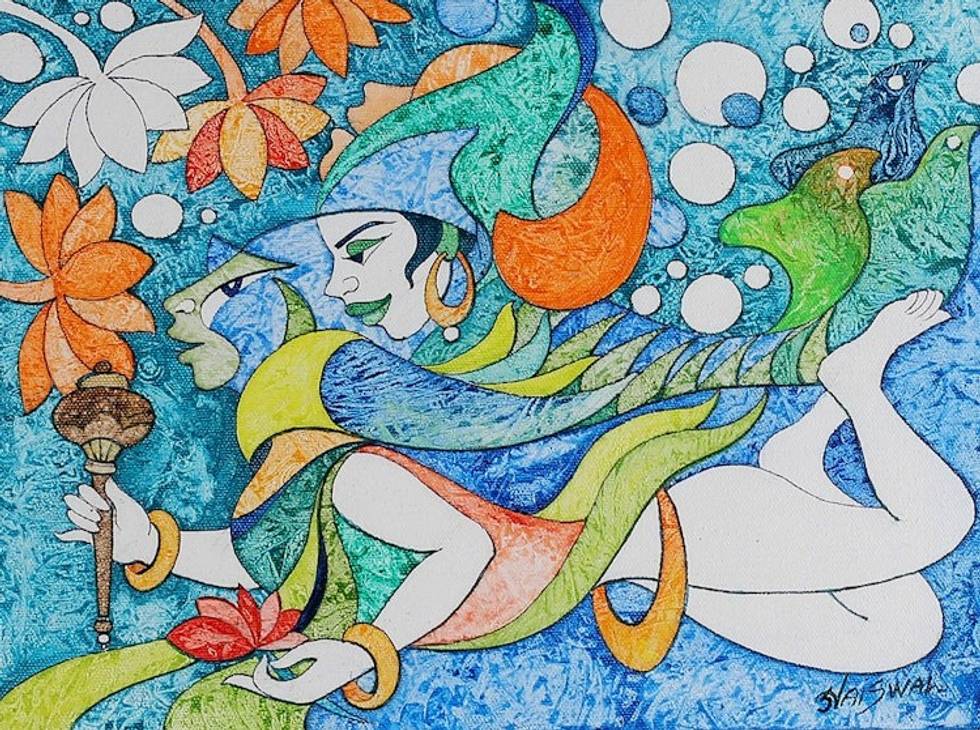 "The divine figure of Matsya, the first incarnation of Lord Vishnu, swims in this enchanting acrylic scene by artist Sunil Jaiswal. The marine world comes to life in this impressionist painting, made in honor of Matsya's battle to save humanity from destruction.