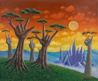 "'Nature is something simple and will always give love to anyone on this earth,' says Aldi while painting this expressionist composition in honor of Mother Nature's spirit. Acrylic brushstrokes reunite on canvas, depicting a forest under the warm light of an evening, with the view of a Javanese city in the background as a symbol of human progress.