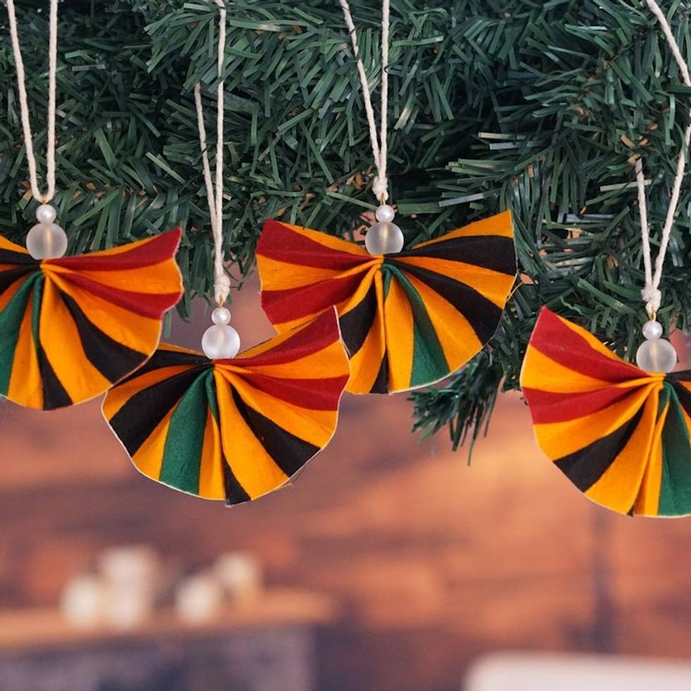 "Ghana's festive spirit will fill your environment with happiness thanks to this set of four cotton ornaments handcrafted by K. Baka. Choosing a vibrant palette, the artisan adds recycled plastic and glass beads to the accessories, titling the work Afafrantor, meaning 'butterfly' in the Akan language."