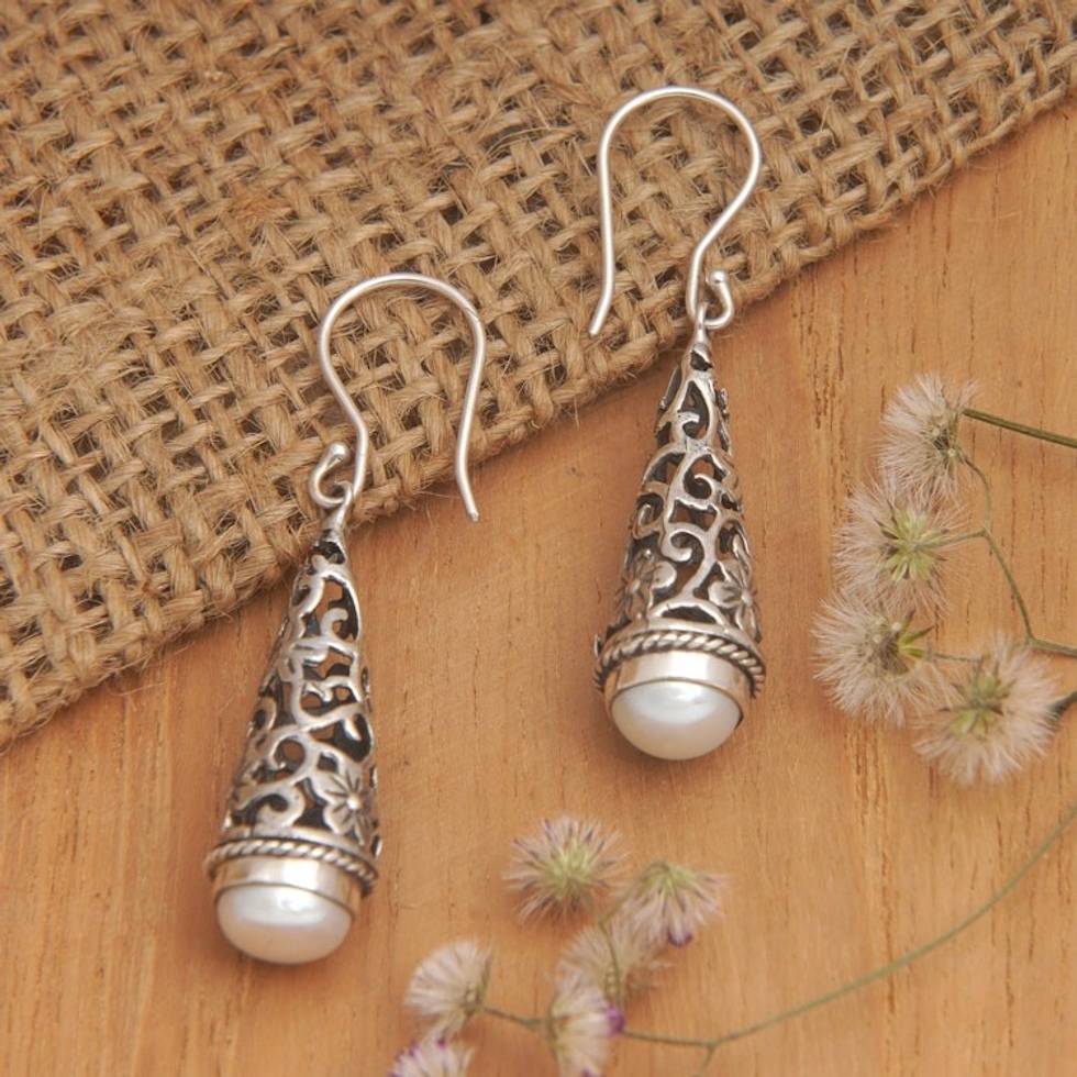 Vine and Floral-Themed Dangle Earrings with White Pearls 'Vine's Divine Bloom' Item ID: 2671764978