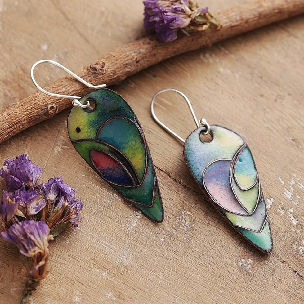 Vitreous Enamel on Copper Peacock Feather Dangle Earrings 'Peacock Feather Glory' Item ID: 2671781126