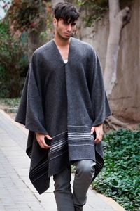 Warm Men's Alpaca Blend Poncho with V-neck from Peru 'Gray Nazca' Item ID: 2671820434