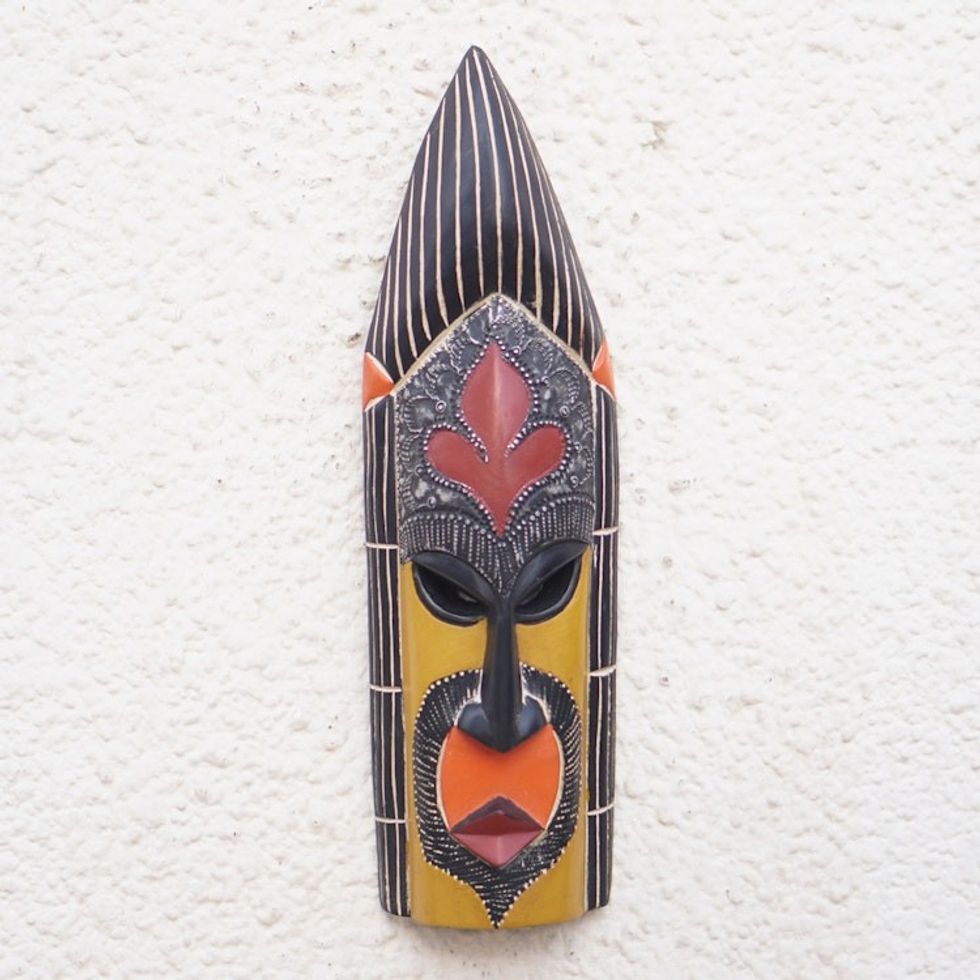 "Embossed aluminum plates crown a traditional creation by Victor Ayambire from Ghana. Proud of his heritage, the talented artisan uses sese wood to create this African mask in a palette of yellow, orange, red and black hues, creating a captivating aura and enhancing the metallic accents. As an homage to the country, Victor titles this exquisite creation Atanga, which means 'stone' in the Ghanaian upper east language."