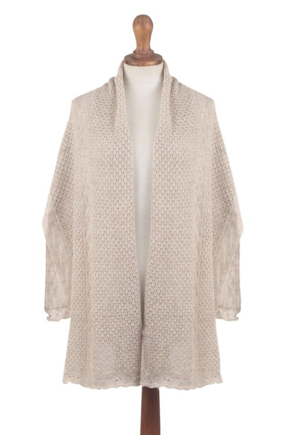 Warm White Alpaca Blend Eyelet and Cable Knit Shawl 'Dreamy Mist' Item ID: 2669907610