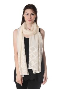 Warm White Embroidered Sheer Cotton and Silk Blend Shawl 'Chikan Chic' Item ID: 2671790394