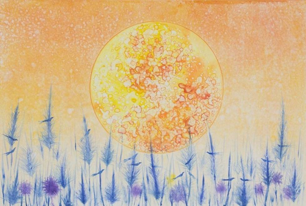 Watercolor Monoprint of Blood Moon and Blue Grass 'My Home II' Item ID: 2669889511