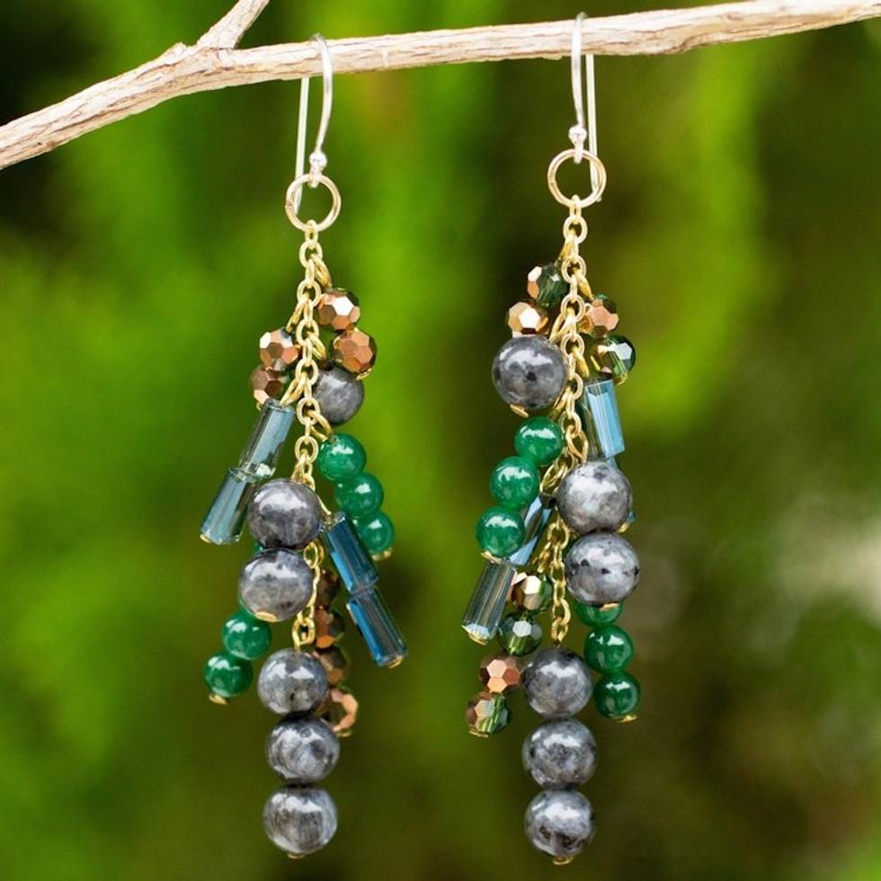 This necklace features stones in all of the cool colors (blues, greens, and purples). It feels substantial and heavy (due to all the stones) but looks light and delicate when worn (due to the nature-inspired design). I immediately fell in love with this necklace and decided to purchase Nareerat's Thai Joy earrings (with matching stones) to have a complete set. Thank you, Nareerat, for my lovely necklace!