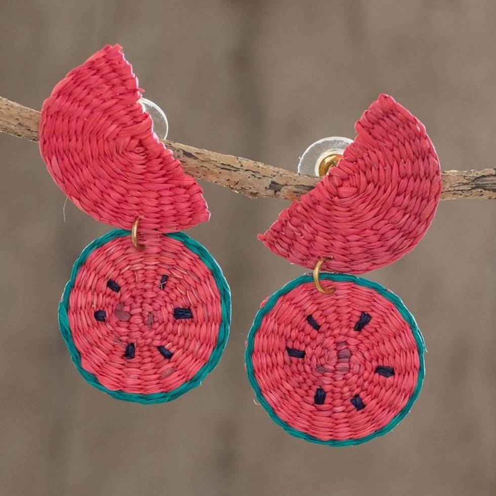 Watermelon Wedges Handwoven Junco Reed Dangle Earrings 'Watermelon Feast' Item ID: 2671777001