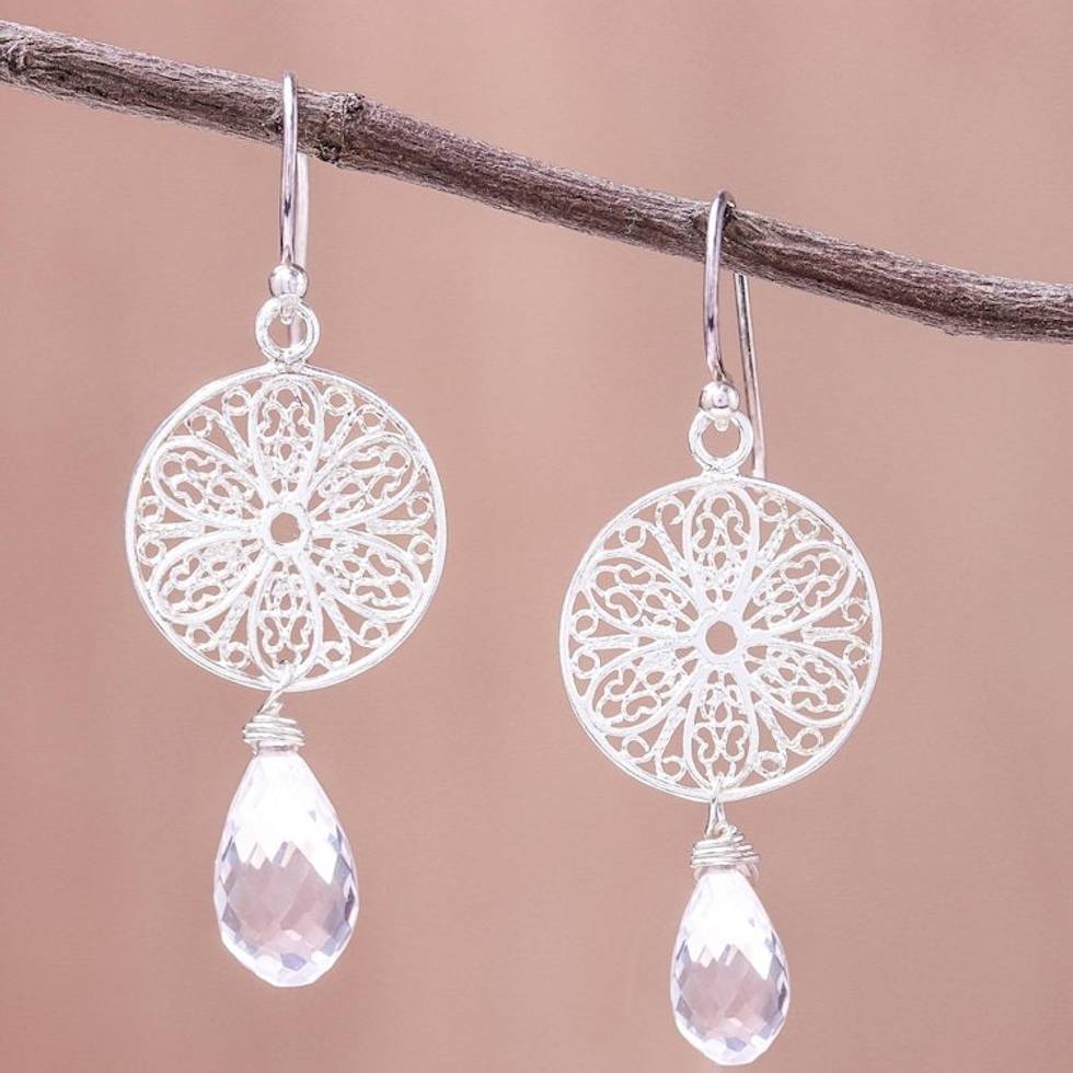 Web Motif Rose Quartz Dangle Earrings from Thailand 'Glittering Web' Item ID: 2671798406