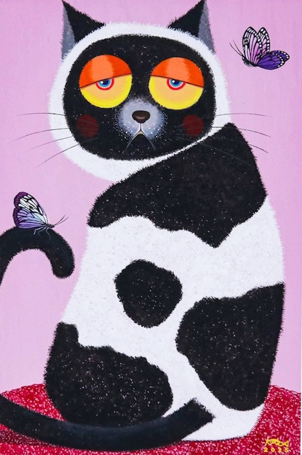 "Thai artist Surangrat paints a feline portrait from a whimsical perspective. A white and black cat sits peacefully at the center of this acrylic composition, showing a funny expression that honors the sometimes-silly feline mind.