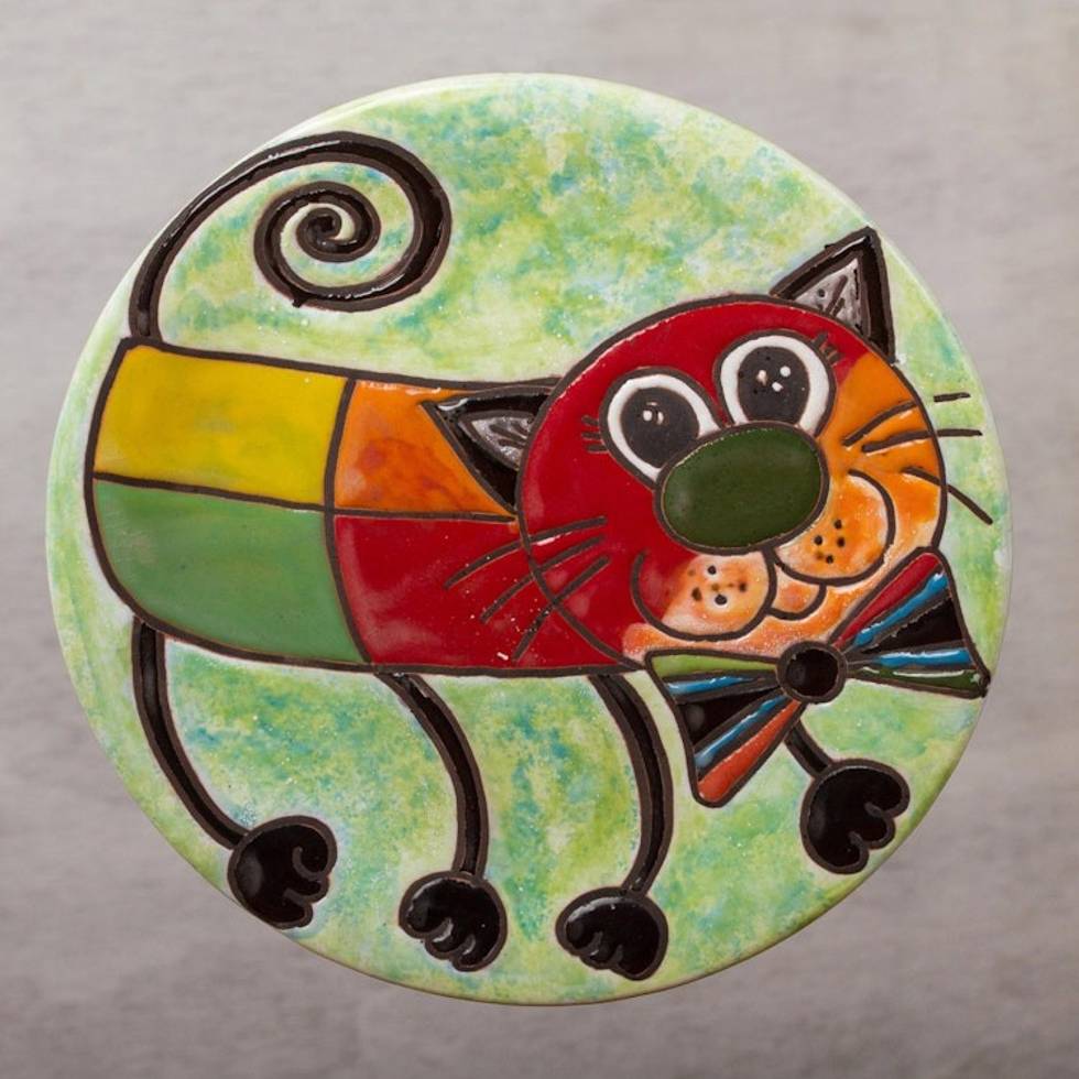 I have owned cats since 1980. I love to have a few decorative items in my home that display my love of felines. This whimsical plate is so cheerful and I love the vibrant colors. I put it in a stand and have it in my guest room.