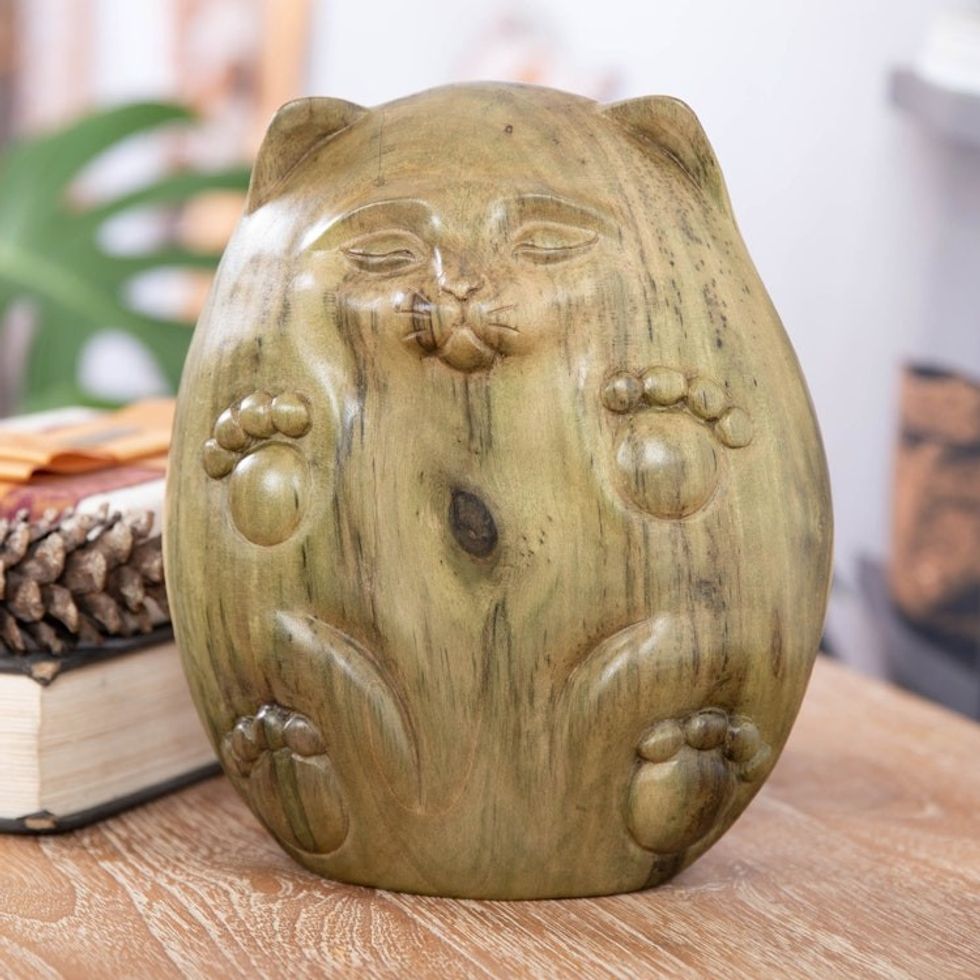 Whimsical Cat-Themed Hibiscus Wood Sculpture from Bali 'Feline Baby' Item ID: 2671762948