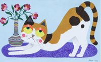 Whimsical Cat-Themed Naif-Themed Acrylic on Canvas Painting 'Morning Stretch in Bloom' Item ID: 2676653134