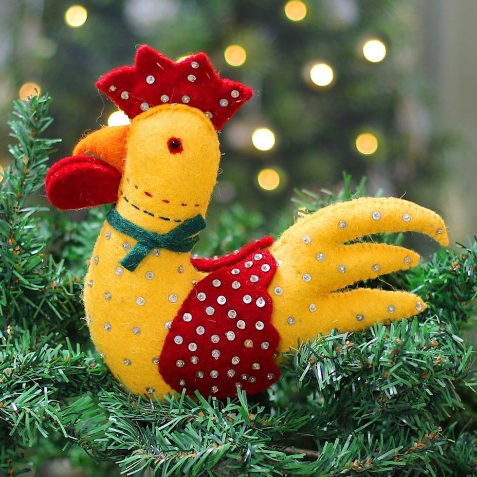Whimsical Rooster-Themed Wool Felt Tree Topper from India 'Rooster Festivity' Item ID: 2671781469
