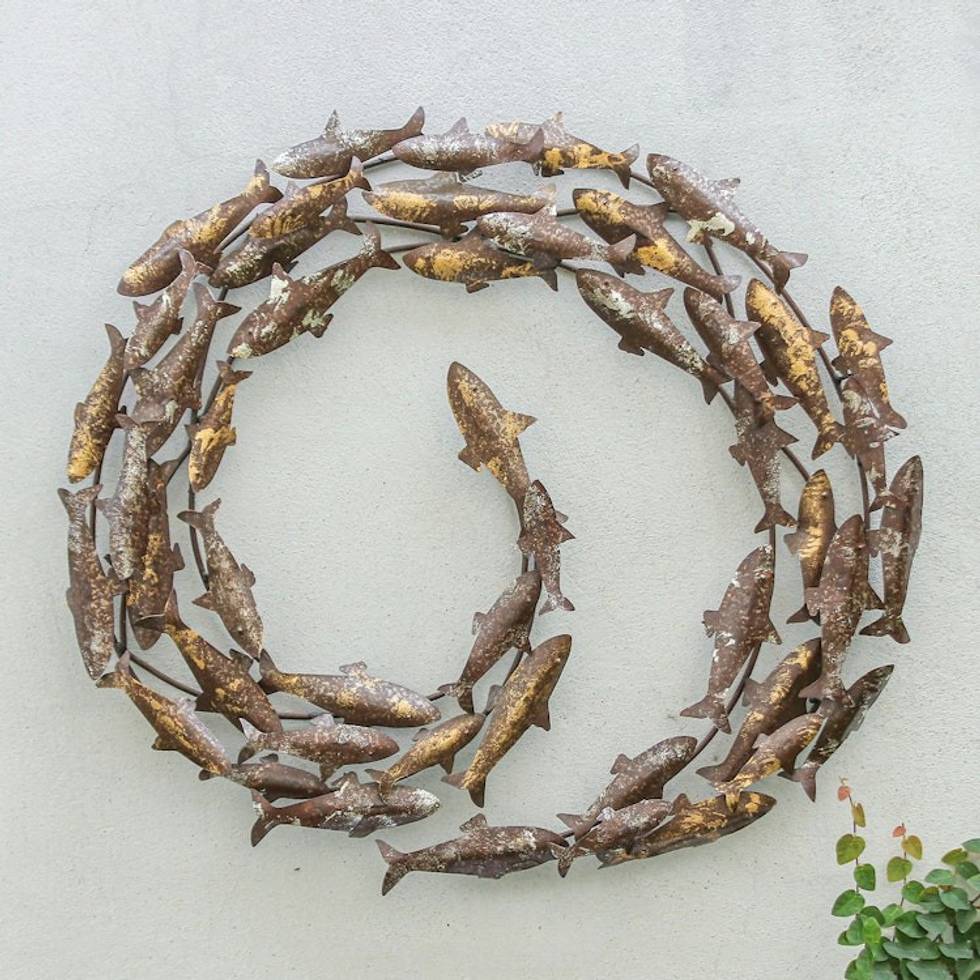 "Enigmatic fish pave the way to an enchanting aquatic world. Artisan Narakorn Wongnitkorn of Thailand works with steel to craft this captivating homage to serene waters, allowing for a hypnotic illusion in this whirlpool-shaped wall art. Koi fish compose the design, boasting golden and silver hues as a symbol of prosperity and wisdom."