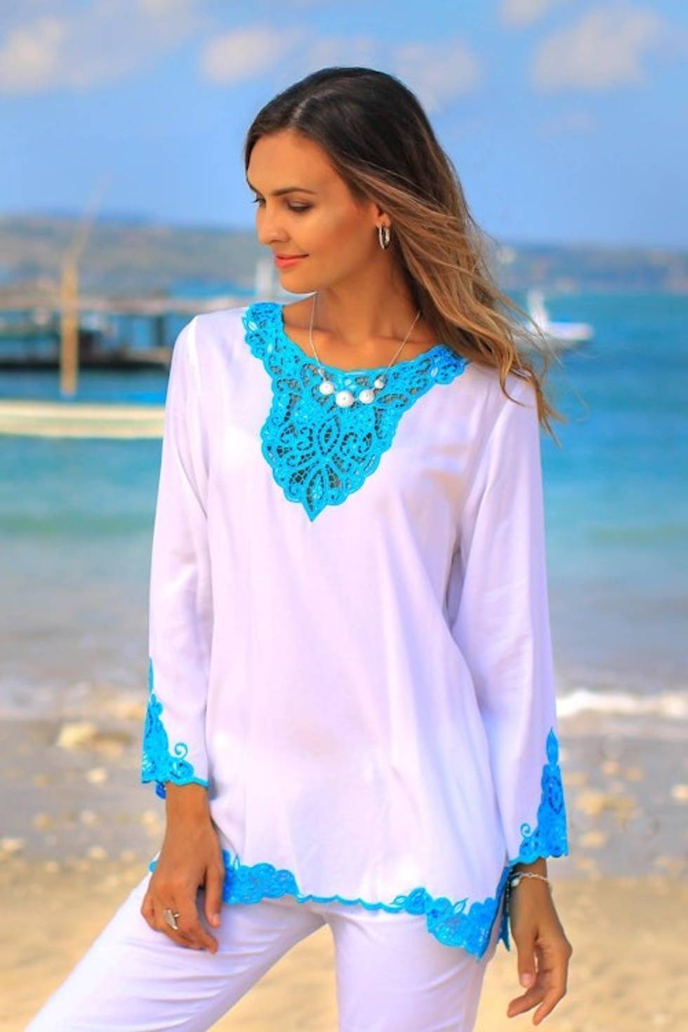 White and Turquoise Embroidered Rayon Tunic from Bali 'Kayangan in White' Item ID: 2669891830