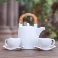 "This elegant contemporary tea set is designed and crafted by Bali's Nyoman Suarmini. The teapot, cups and saucers are crafted of ceramic with a stylish matte white glaze. The teapot boasts a sturdy handle crafted from teak wood. Enjoy a teatime tete-a-tete with this sleek ensemble."