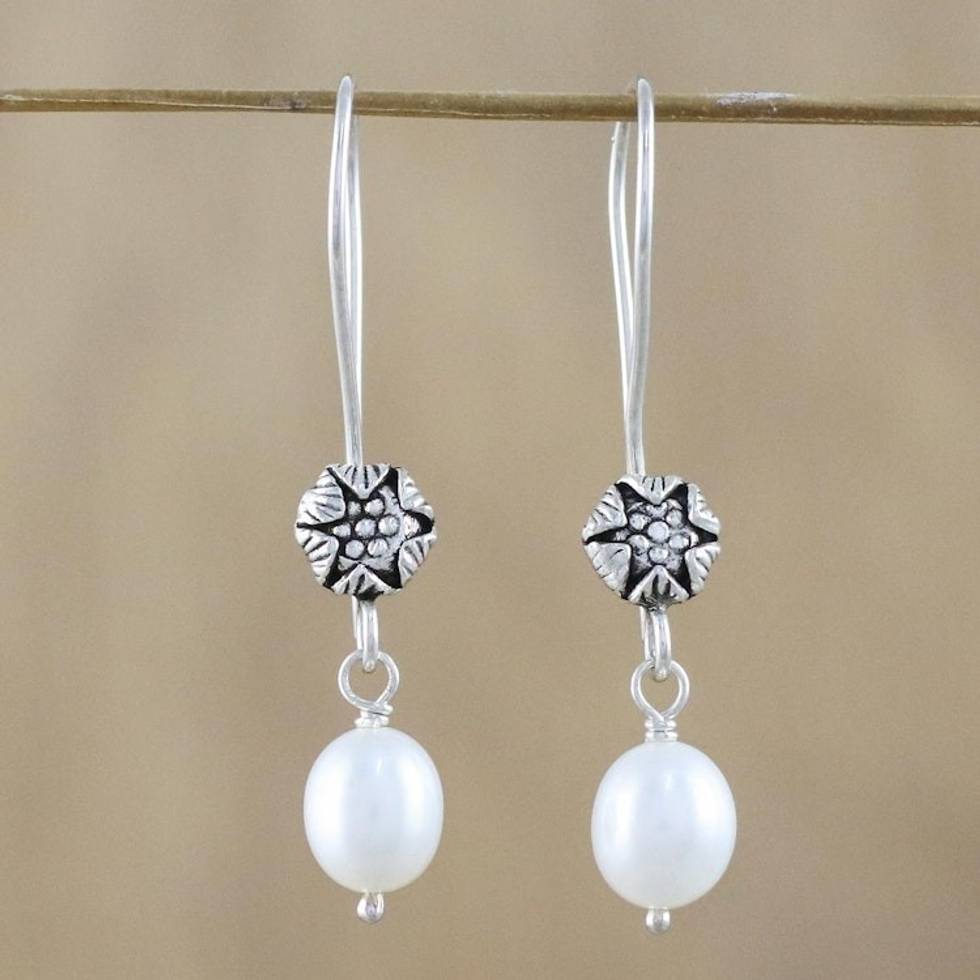 "Petite flowers emerge from their casings on these 950 silver dangle earrings presented by Thailand's Withaya Cheunjit. The buds top luminous freshwater cultured white pearls for a design that is distinctly feminine and yet subtle."