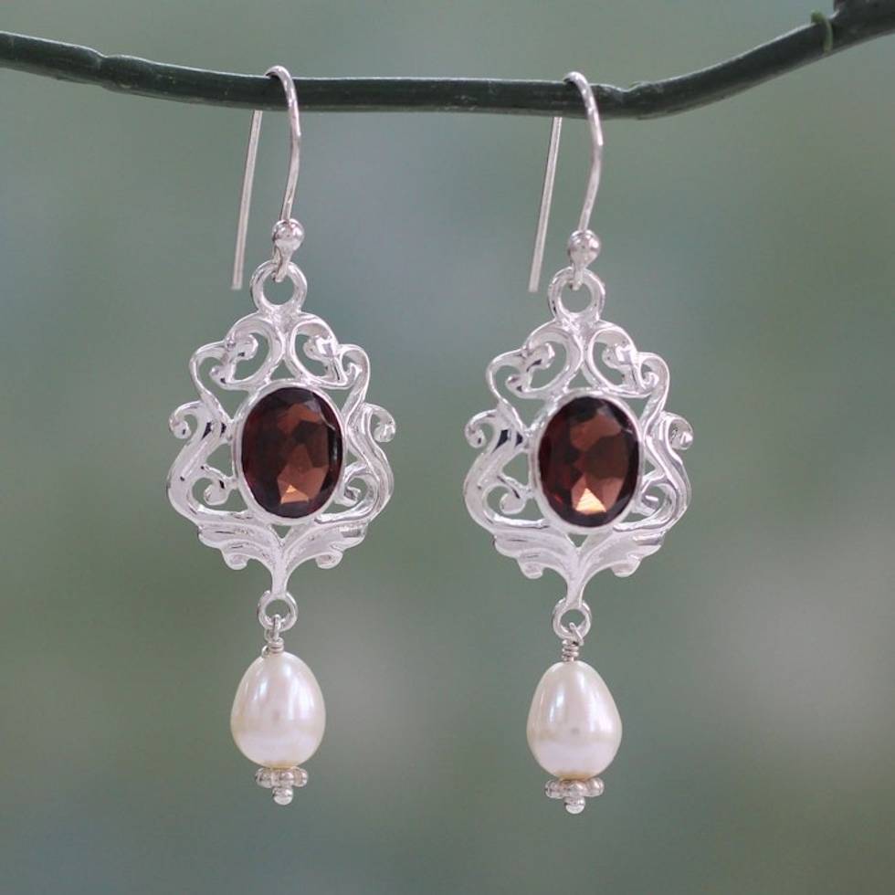 White Pearl and Garnet Earrings on Sterling Silver 'Classic India' Item ID: 2671619952