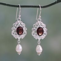 I love these earrings. The smoky quartz has a depth of color that catches the light in different ways as the earrings move. The pairing of the topped pearls lend substance giving the earrings a quality look and feel.