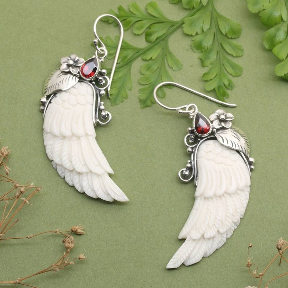 Wing-Shaped Natural Garnet Dangle Earrings from Bali 'Flight in the Passionate Eden' Item ID: 2671669777