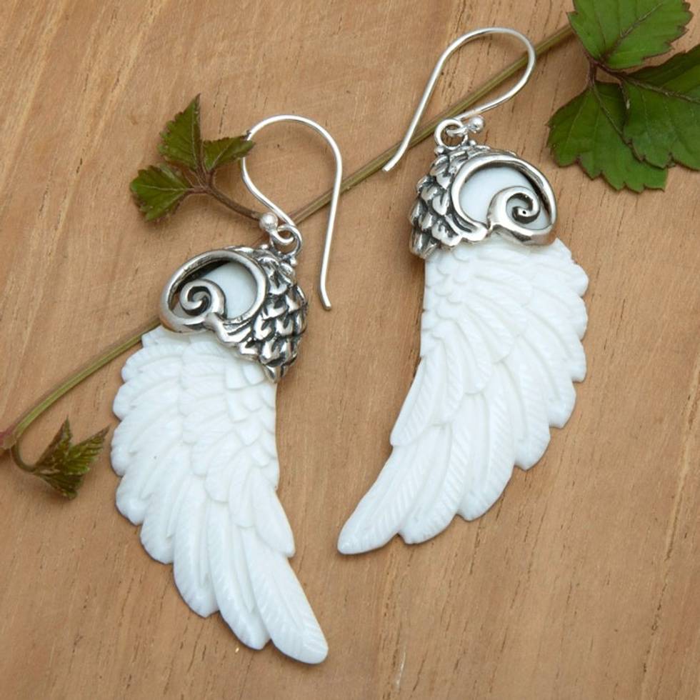 Wing-Shaped Sterling Silver Dangle Earrings in White 'Heaven Plumage' Item ID: 2671764954