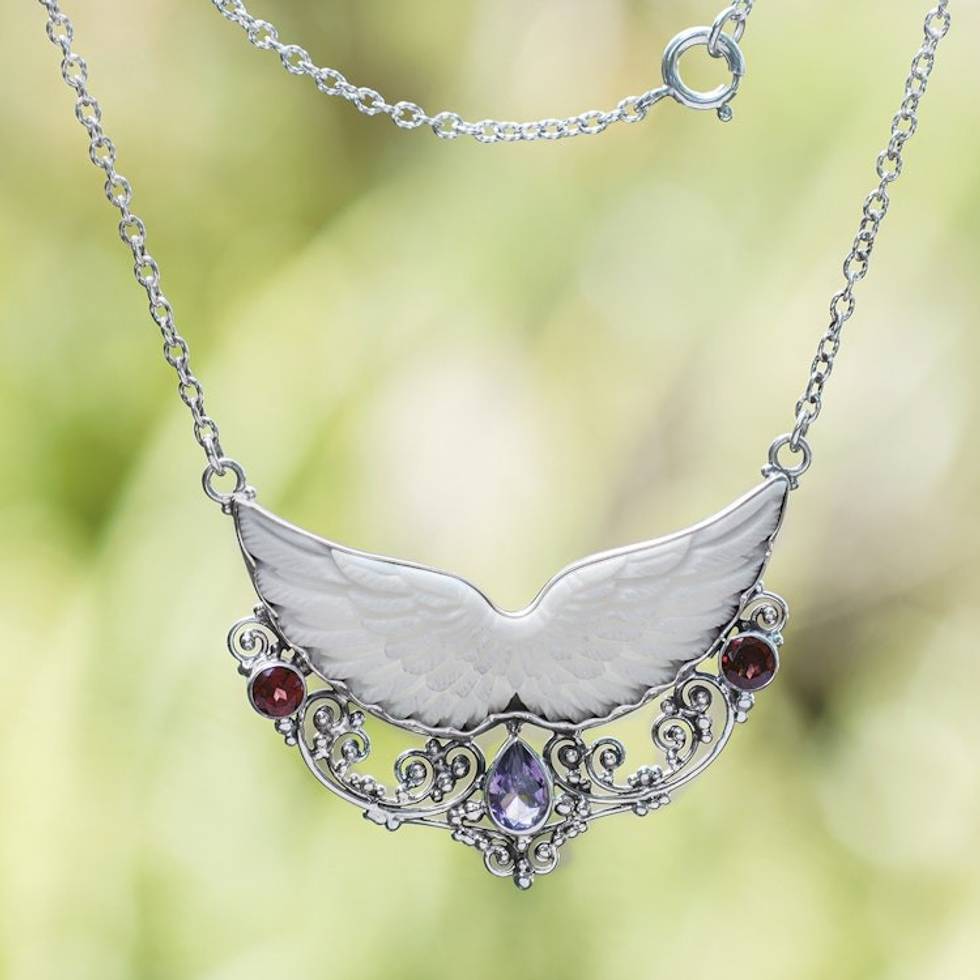 Wing-Themed Pendant Necklace with Amethyst and Garnet Gems 'Celestial Wings' Item ID: 2671762910