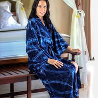 Before finding this product, I searched far and wide for the right robe. I thought I wanted kimono style, but this pattern sang to my soul. Even so, seeing it in person was the real treat! I love to tie-dye and watched your artisan video about the process and yet I still have no idea how you created this layered dye pattern. I love it. I haven't even gotten to the best part. I suffer from hives and itchy skin after I swim or shower. No one seems to know what the cause is, so I have learned to deal. When I first slipped into this robe on after the shower I found it SOOTHED my skin, even better than lotion. It's magical, a necessity in my daily ritual. I am 5'7'' and this robe sits perfectly above my ankle bone. The fit and sleeves make me feel like royalty, although I will say the width of the sleeves make it difficult to do any chores around the house. Oh well, I do the dishes before I shower now. Thank you so much for this wonderful gift from across the ocean.