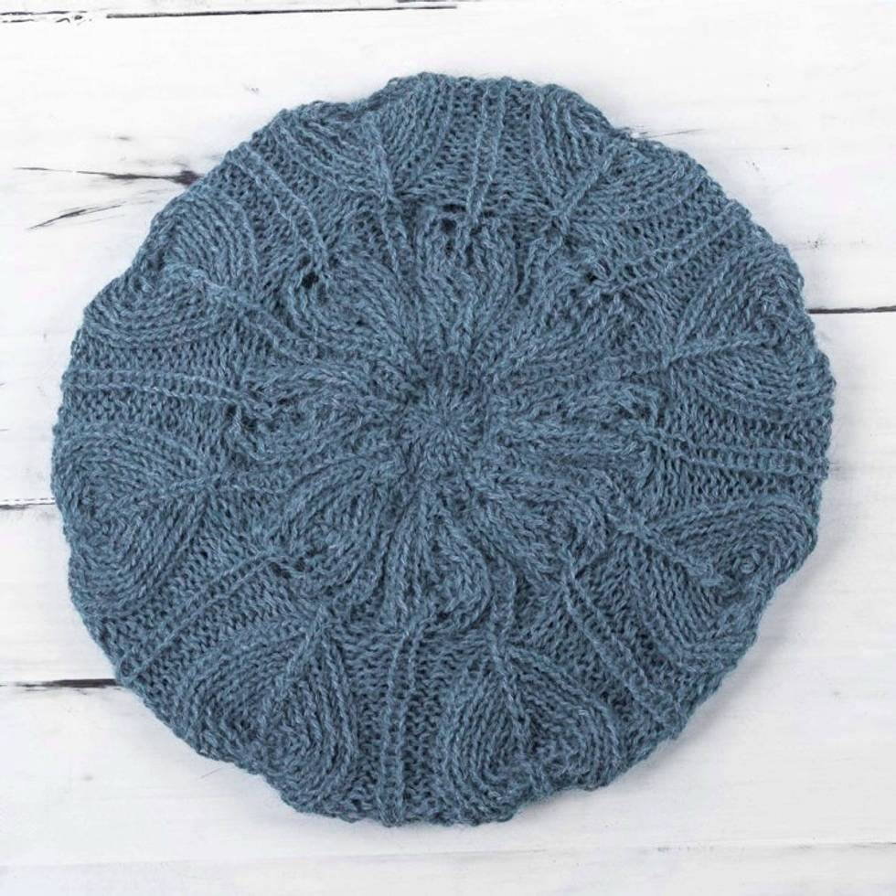 Women's Blue Beret Hat Knitted by Hand in 100 Alpaca Wool 'Azure Leaves' Item ID: 2669907603