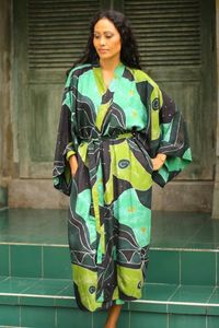 Women's Fair Trade Batik Robe 'Emerald Birds' Item ID: 2670802159
